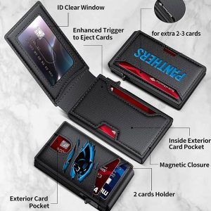 MATERIALS: High-quality PU leather, durable metal pop-up mechanism, and RFID-blocking technology to keep your cards safe and secure.