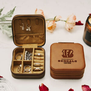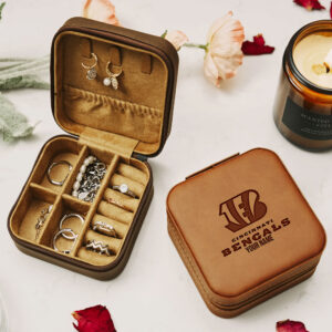 Keep your precious jewelry safe and organized with our personalized Cincinnati Bengals jewelry boxes. These travel cases are the perfect size to store your favorite pieces, whether you’re on the go or just need a place to keep them tidy at home. The Cincinnati Bengals Emblem on the box makes it a perfect item for any Cincinnati Bengals Lovers!