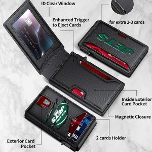 MATERIALS: High-quality PU leather, durable metal pop-up mechanism, and RFID-blocking technology to keep your cards safe and secure.