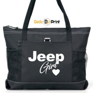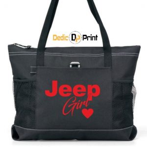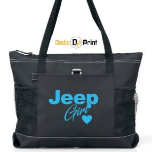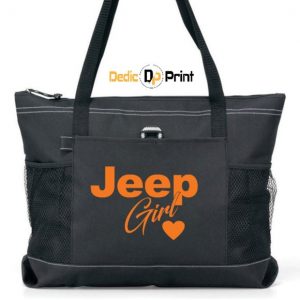 Jeep Girl Zippered Tote Bag made to order with many imprint colors available. Please visit other listings with different color imprints. Contact us for custom imprints. Features: 20″W x 14″H x 4″D Back panel is Black Two side mesh pockets Front pocket with pen loop Zippered main compartment 29½” Black webbing shoulder straps 600-denier polyester Imprinted in the U.S.A.